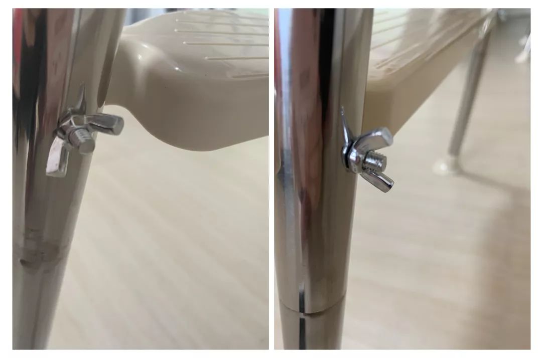 ④勵(lì)步、卡神媽咪調(diào)節(jié)腳踏的螺母露在外邊的部分較多,且邊緣較為尖銳。如果寶寶的腿晃來晃去,可能就會(huì)被劃到。其他幾款餐椅的螺母圓潤,相對更。