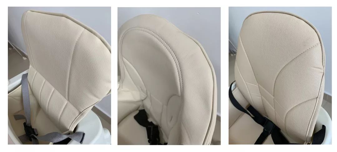 ③卡神媽咪、森美尚的靠背為拼接式設(shè)計(jì),而且沒有PU皮套保護(hù)。因此,如果靠背處灑上了湯水,可能會(huì)殘留在接縫處,不易徹底清洗。
