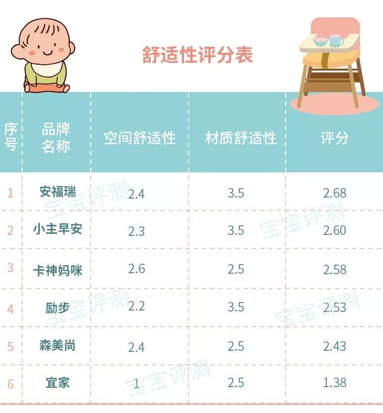 綜合以上2項(xiàng)測評,6款寶寶餐椅的舒適性綜合得分如下(滿分5分):