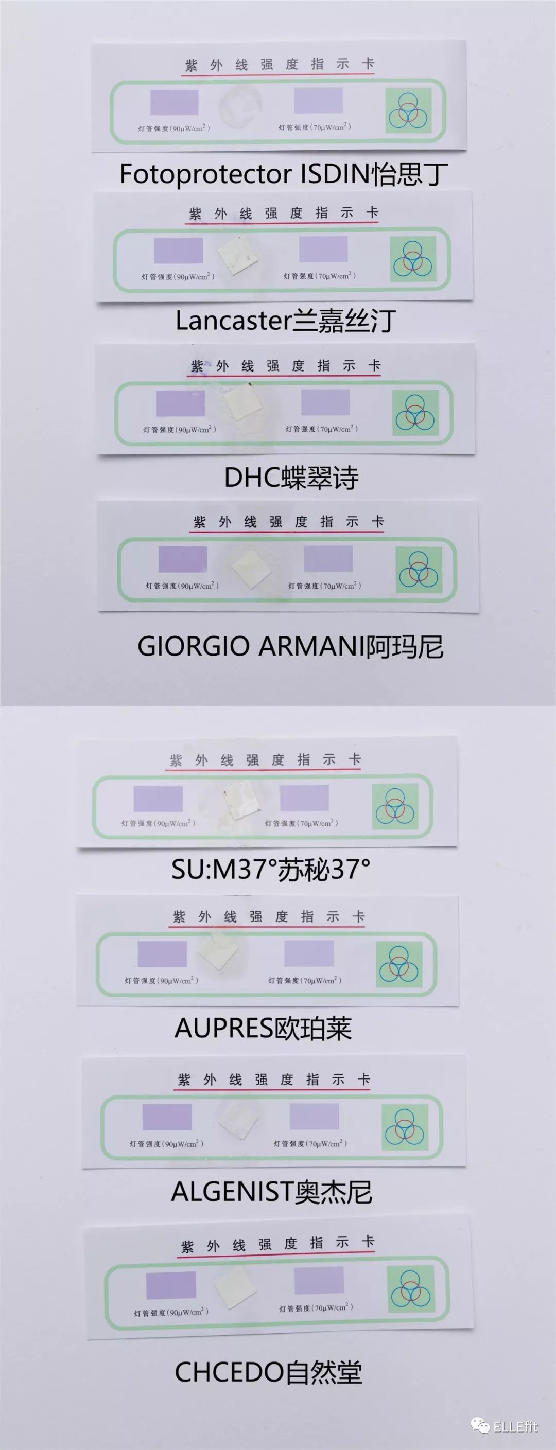 此次入圍ELLEfit Choice004的23款防曬霜防曬能力都不俗(由于圖片基本沒(méi)有變化,這里只曬出8張),在紫外線燈下暴曬10分鐘(相當(dāng)于中午在戶外運(yùn)動(dòng)1小時(shí)),防曬卡都沒(méi)有任何的變化。