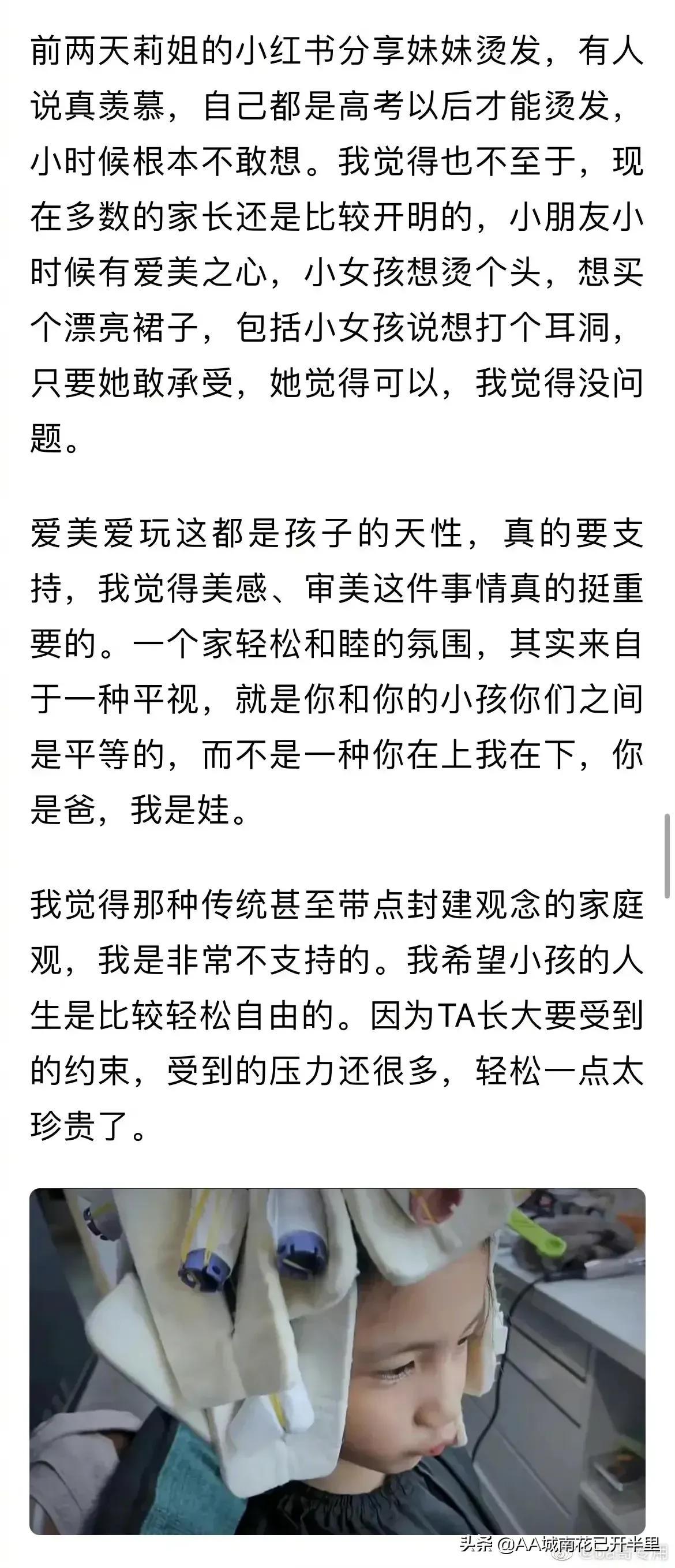 就是 我家女兒周末的時候還會偷偷涂我的口紅呢 這不都很正常嗎。黃磊也是不淡定,說那么多干嘛…真那么護犢子,就別動不動曬,安安靜靜過自己的小日子…因為大眾平臺就存在各種看法各種聲音…不可能都是贊美和祝福。況且置疑聲中,大部分也沒什么惡意…何必反唇相譏,說別人什么封建家庭…以前覺得他還行,現(xiàn)在覺得他也不過如此…我女兒小的時候看到別人的卷發(fā)也很喜歡,我也帶她燙過一次頭發(fā),雖然燙發(fā)對發(fā)質(zhì)有損,但又不像大人一樣隔一段時間燙一次那么頻繁,頭發(fā)又不是不長,長長了把受損頭發(fā)剪了就是了,沒必要上綱上線,大一點上了三四年級就不再燙了就是了。如果學(xué)校沒有要求,我女兒想要嘗試,我也會酌情考慮的。我不是啥思想開放的家長,我只是不覺得燙頭發(fā)就是壞孩子,而且在每一個好奇的階段鼓勵她去嘗試,也不一定是壞事!我女兒上幼兒園喜歡我的美甲,我會買指甲油給她抹,她很開心得到滿足后也沒說天天要擦。給她買了美甲貼紙得瑟了一個星期不準(zhǔn)我撕,也不了了之了!喜歡愛莎高跟鞋,買了一雙臭美了幾個月(只在家里和小區(qū)穿)好像也就那樣了!喜歡公主裙安排上,天氣一熱死活不穿了,自己自覺挑短袖短褲,不需要跟我扯皮幼兒園穿裙子不方便的問題。還有亮晶晶的寶石耳貼,花里胡哨的公主首飾。這些都不在我的審美,但是真的一個小小的物品就能讓孩子滿足開心,何樂而不為?我更贊同的是及時行樂,誰也不能自己就能安穩(wěn)過完一生,只要當(dāng)下孩子心存善良,樂觀積極,正直友愛,她就是個好孩子!