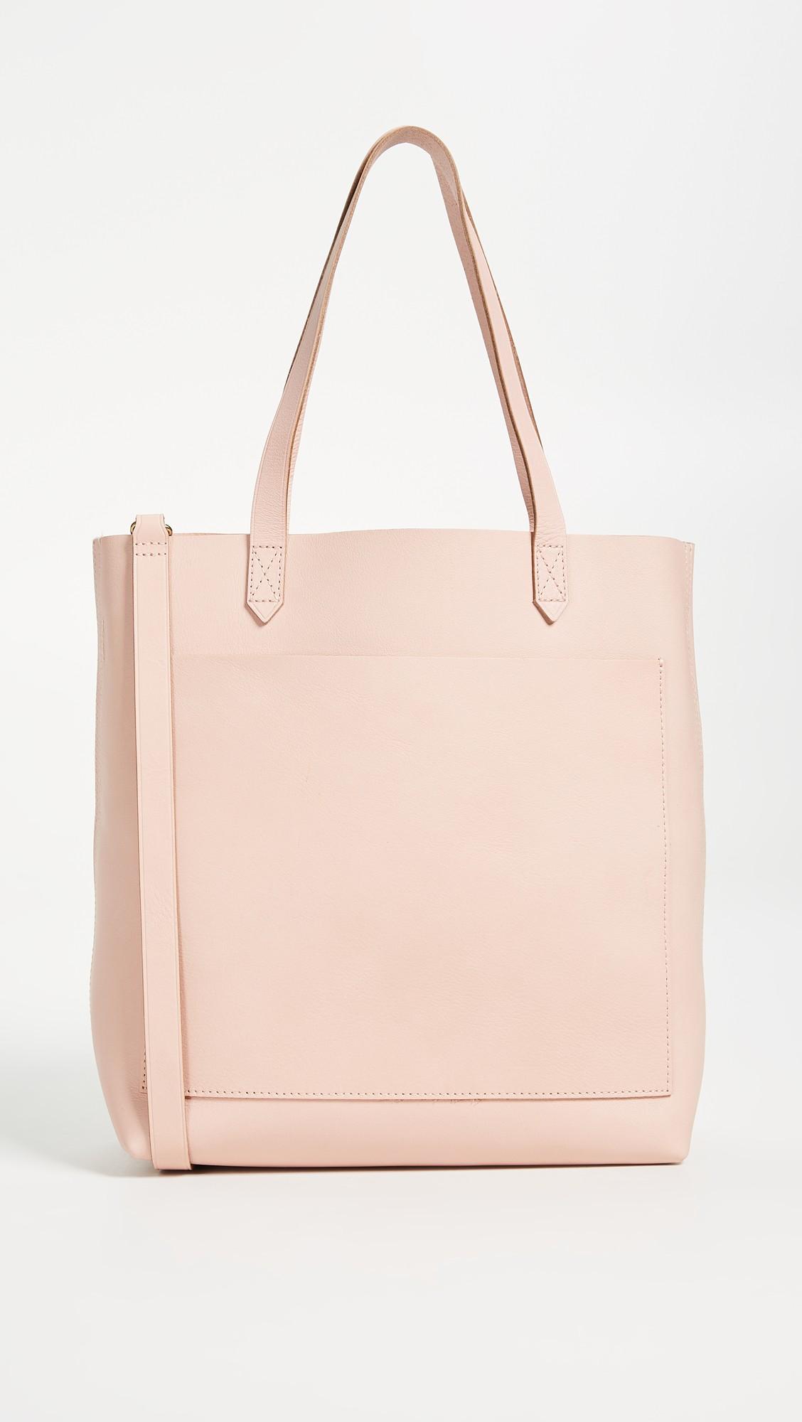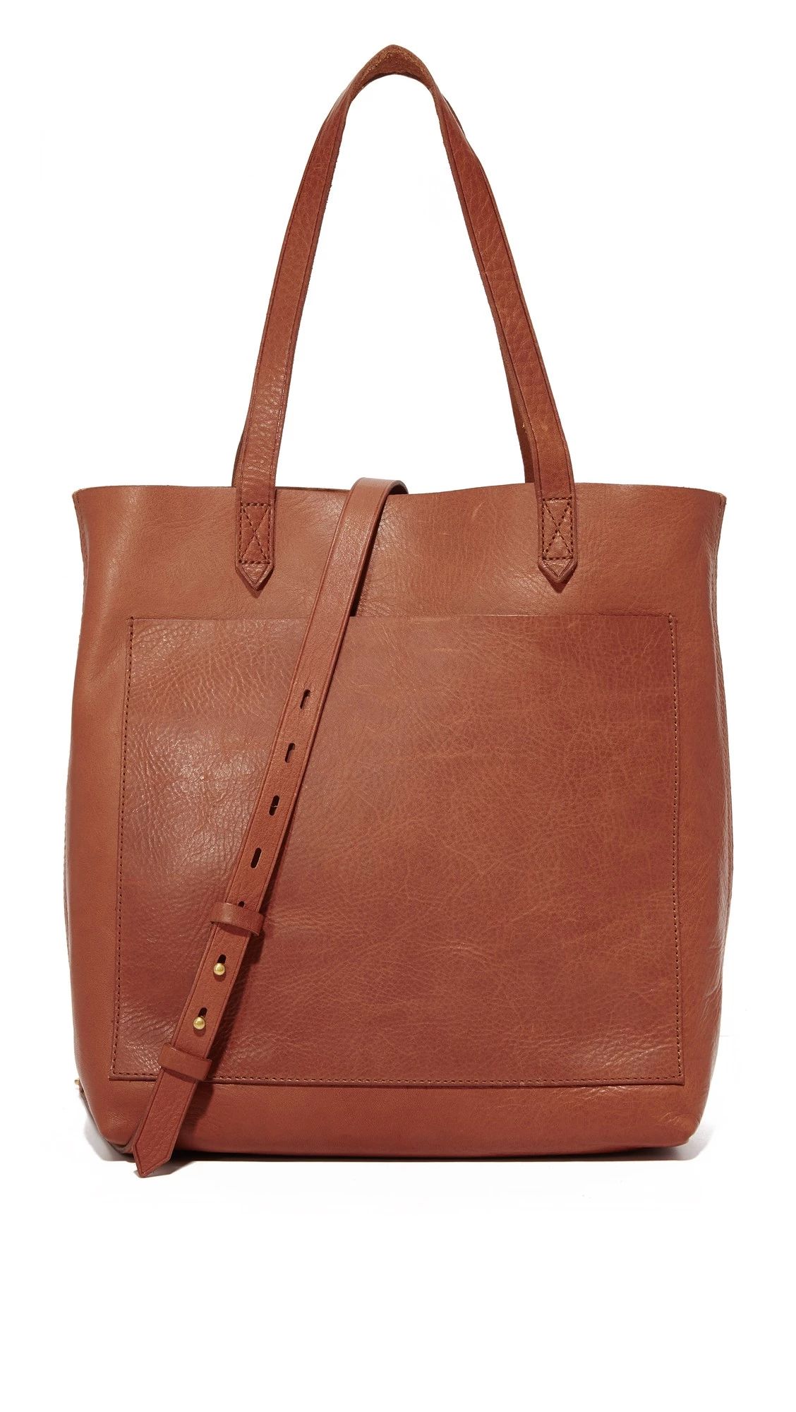 這一類托特包通常包口比上一款略微狹窄一些,大部分可以單肩背,因為其狹長的造型在視覺上搭配空間更大。madewell的totebag就是這一類包的典型代表:
