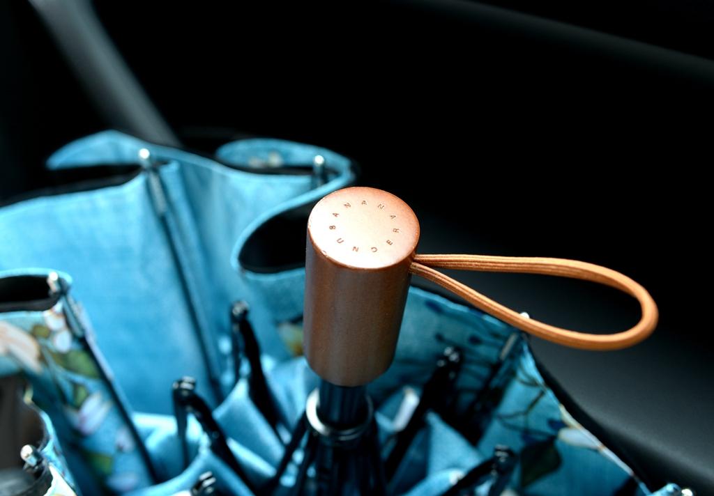 3、木制手柄。從早的塑料細長手柄到原形手柄,再到如今的木制手柄,感覺在不斷追求質感和更好的體驗。同時手柄、傘架、傘布處都有不同的LOGO,細節(jié)之處都不放過。