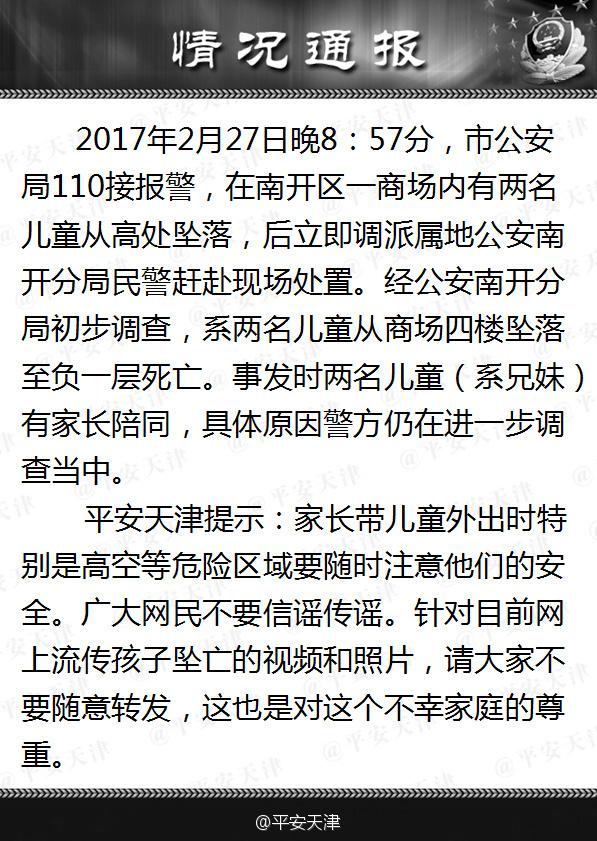 2月27日晚,天津大悅城2名孩子從4樓掉落至負(fù)一層,當(dāng)場(chǎng)死亡,事發(fā)孩子家長(zhǎng)手抱孩子靠近玻璃圍欄天井處,一時(shí)沒(méi)抱住孩子致悲劇發(fā)生??!再次提醒各位家長(zhǎng),帶孩子外出,一定看護(hù)好孩子,預(yù)防意外事件發(fā)生!