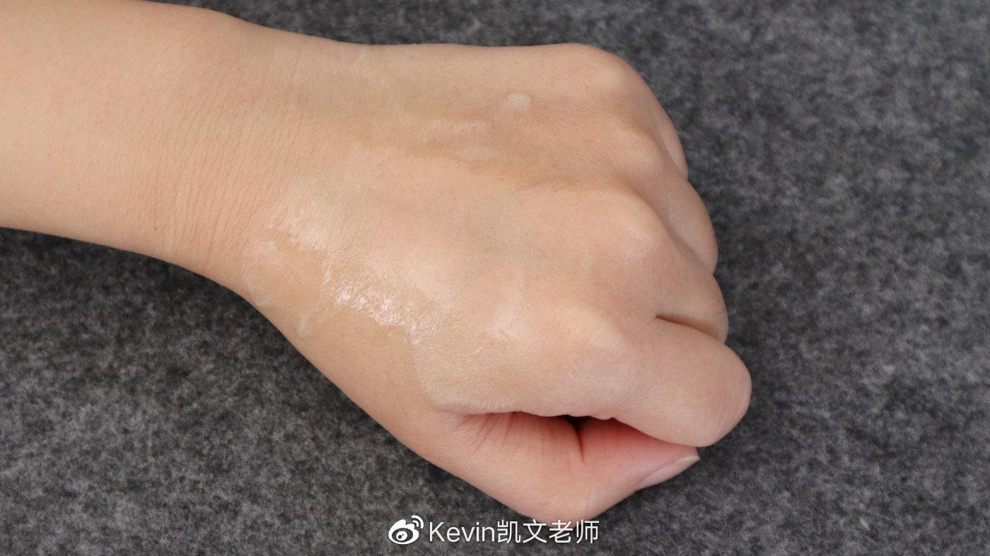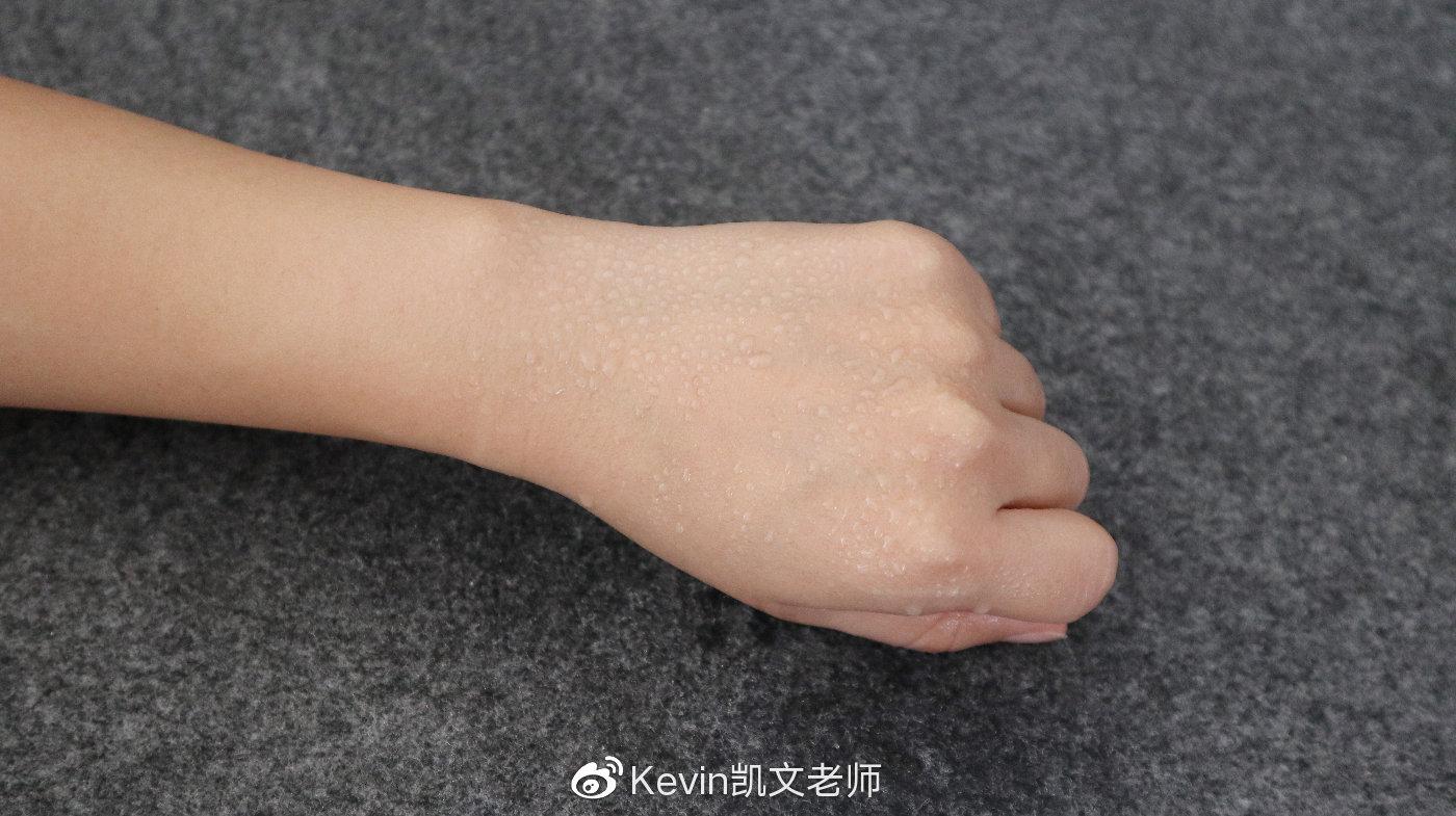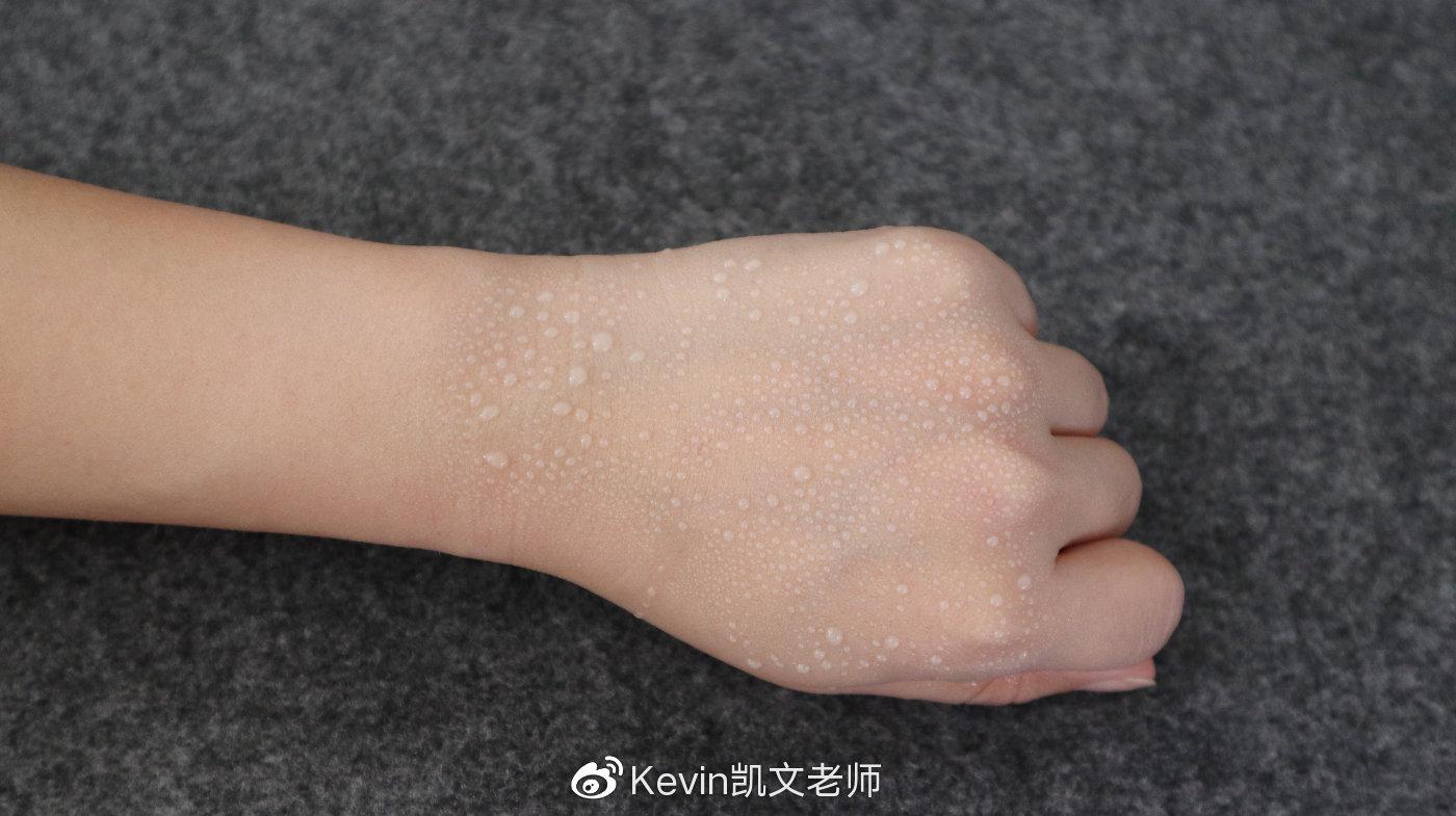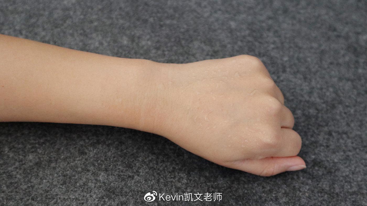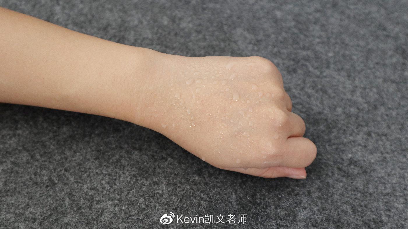 在手背上噴水測試它的防水性,表現(xiàn)也很不錯