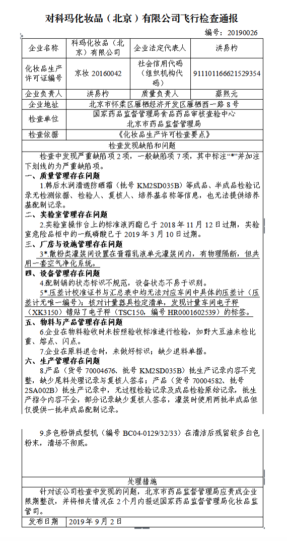 近期,藥品監(jiān)督管理局組織對多家化妝品企業(yè)進行了飛行檢查,并通報了檢查結果。記者注意到,國產(chǎn)美妝品牌“韓后”的OEM(俗稱代工生產(chǎn))企業(yè)科瑪化妝品(北京)有限公司,因存在嚴重缺陷2項,一般缺陷7項,涉及質量管理、實驗室標準液過期、廠房設施、設備管理等多項問題,情節(jié)嚴重,被責令限期整改。