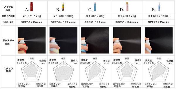 從性價(jià)比方面來看,B款Vibeke's UV protaction spray是大容量,頭發(fā)、全身都可使用,性價(jià)比很高,同時(shí)清爽度、持久性方面也不錯(cuò),也不易浮白,出現(xiàn)不勻的情況。E款herbal garden SPF 防曬噴霧的性價(jià)比也相對(duì)較高,保濕也較好,不易出現(xiàn)不勻的情況,但持久性和清爽度稍顯不足。A款Rose Luxury spray和D款Fernanda Fragrance extra UV spray Mariarigeru在保濕方面較好,但在持久性、均勻性方面稍顯一般。
