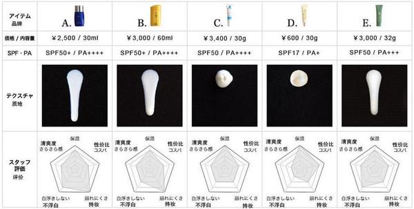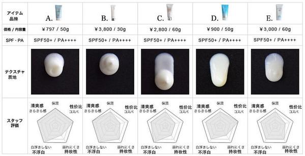 由此可見,A款碧柔 Biore Aqua Rich水活防曬凝蜜以的優(yōu)勢(shì)戰(zhàn)勝了另外四款!不浮白是指在涂抹防曬霜時(shí)不會(huì)出現(xiàn)涂抹不勻、不與皮膚相溶的白色粉末。碧柔 Biore Aqua Rich水活防曬凝蜜僅需797日元(40元),除了持妝方面稍顯欠缺,需經(jīng)常補(bǔ)充涂抹以外,在保濕、清爽度、性價(jià)比、不浮白等四方面都是相當(dāng)不錯(cuò)的,怪不得一直霸占日本COSME大賞防曬排行榜的前三甲。