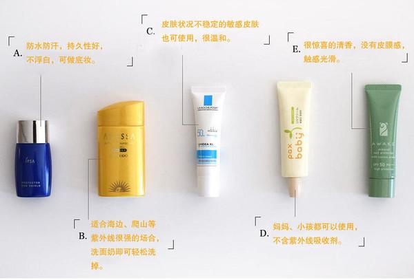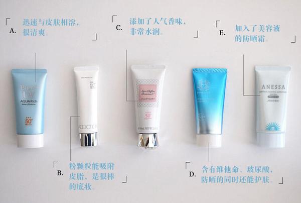 D款Kiss Me (奇士美) Sunkiller 水感清爽保濕防曬露 perfect water essence價(jià)格也比較低廉,只要900日元(45.5元),保濕、清爽度、不浮白方面都還挺不錯(cuò),性價(jià)比較高,但在持久性方面跟碧柔一樣還是比較欠缺。E款安耐曬美容液保濕新藍(lán)瓶防曬霜是大家很熟悉啦!安耐曬一直是深受國(guó)內(nèi)妹紙歡迎的日系防曬霜,它在保濕、清爽度、不浮白、持妝方面都比較不錯(cuò),但是價(jià)格卻略微偏高,性價(jià)比低。