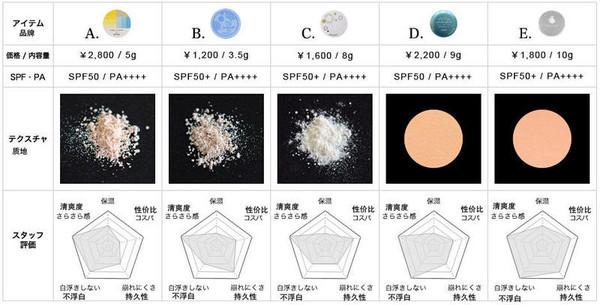 既然是粉末型防曬,清爽度方面都是很不錯(cuò)的,但是保濕方面肯定就有點(diǎn)不足了,不過五款相比A款ETVOS Mineral UV Powder(2015)和E款MSH Time secret mineral UV Powder的保濕相對(duì)較好。持久性方面,五款也相差較大,B款Privacy UV face powder 50 Four Plus和E款MSH Time secret mineral UV Powder相對(duì)持久性較好。從性價(jià)比方面來看,性價(jià)比較高的是C款Paseo UV cut powder Normal和E款MSH Time secret mineral UV Powder。