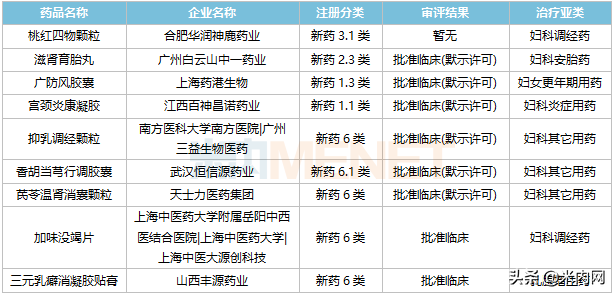 今年1月,華潤三九子公司合肥華潤神鹿藥業(yè)的桃紅四物顆粒以新藥3.1類提交上市申請在審評審批中,該產(chǎn)品是婦科調(diào)經(jīng)藥。此外,8個產(chǎn)品獲批臨床,包括天士力醫(yī)藥集團的芪苓溫腎消囊顆粒、江西百神昌諾藥業(yè)的宮頸炎康凝膠、武漢恒信源藥業(yè)的香胡當(dāng)芎行調(diào)膠囊等,白云山中一藥業(yè)的滋腎育胎丸增加“卵巢儲備功能下降”適應(yīng)癥。