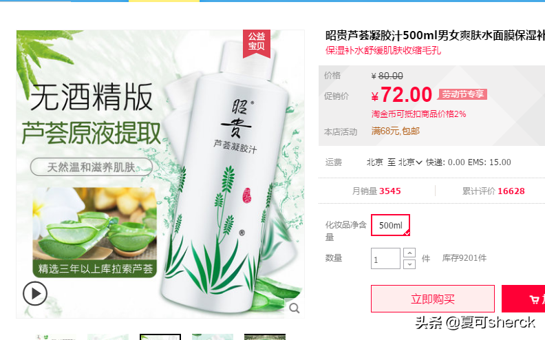 如圖,蘆薈膠汁!500ml 72元。記住這些什么汁啊,什么純露啊,你們買(mǎi)前看看成分表。因?yàn)楹芏嗑褪遣糠痔砑佣?,其?shí)就是個(gè)化妝水,但是昭貴的蘆薈膠汁不是。成分表走起。