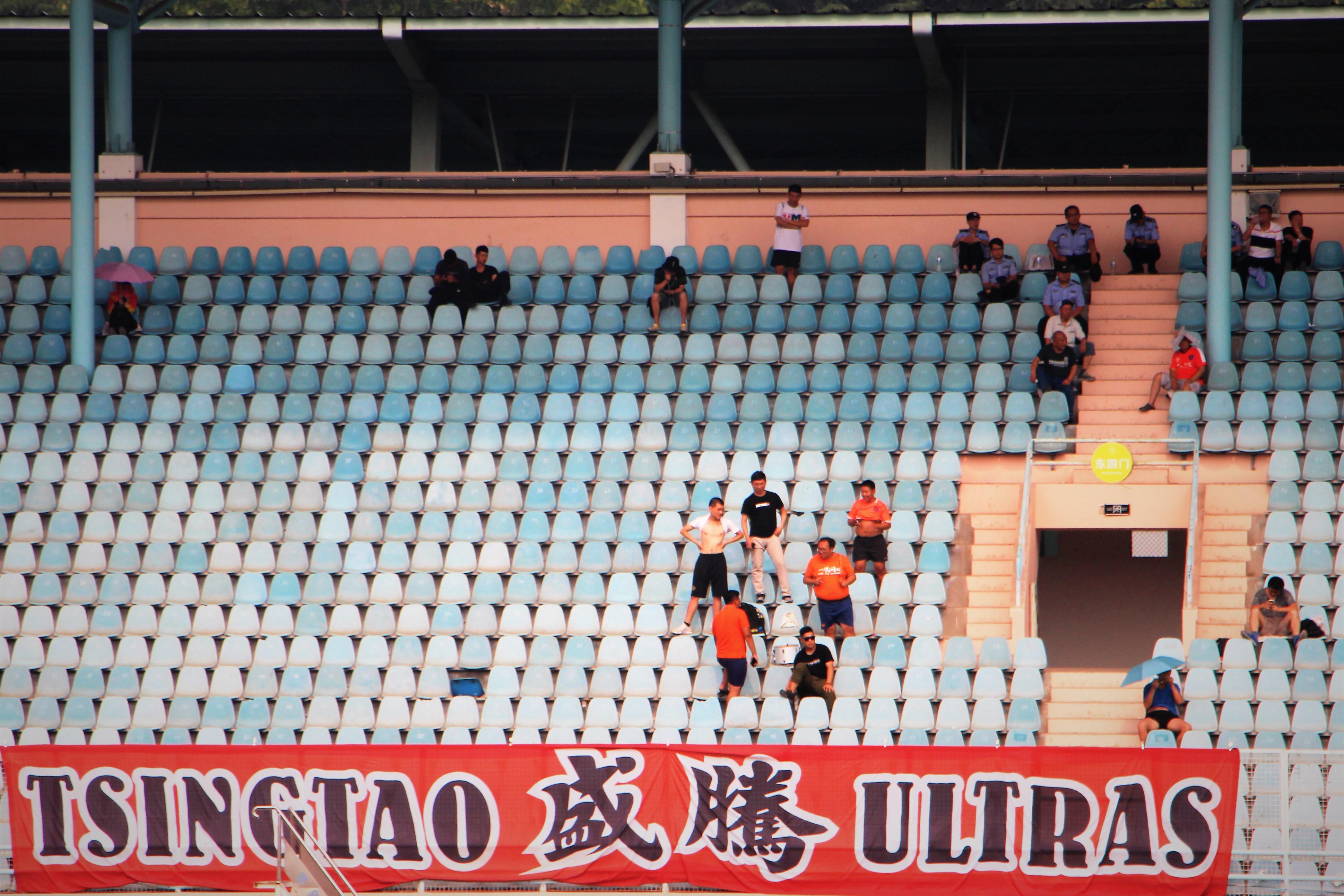 天泰體育場(chǎng)大概是我走進(jìn)過的衛(wèi)生差的體育場(chǎng)了,很難想象廣州恒大、山東魯能、北京國安都曾在這里敗走青城。過安檢后的每一級(jí)臺(tái)階我都走得小心翼翼,生怕一不小心就踩到中超時(shí)期球迷留下的液體。球場(chǎng)座位上的灰塵證明著這里的冷清,似乎每一個(gè)觀眾屁股下面都?jí)|著當(dāng)日的《青島日?qǐng)?bào)》,報(bào)紙上的內(nèi)容則大多和晚上黃海的比賽有關(guān),畢竟在十幾公里外的嶗山區(qū),那個(gè)球場(chǎng)上有克萊奧和亞亞圖雷。