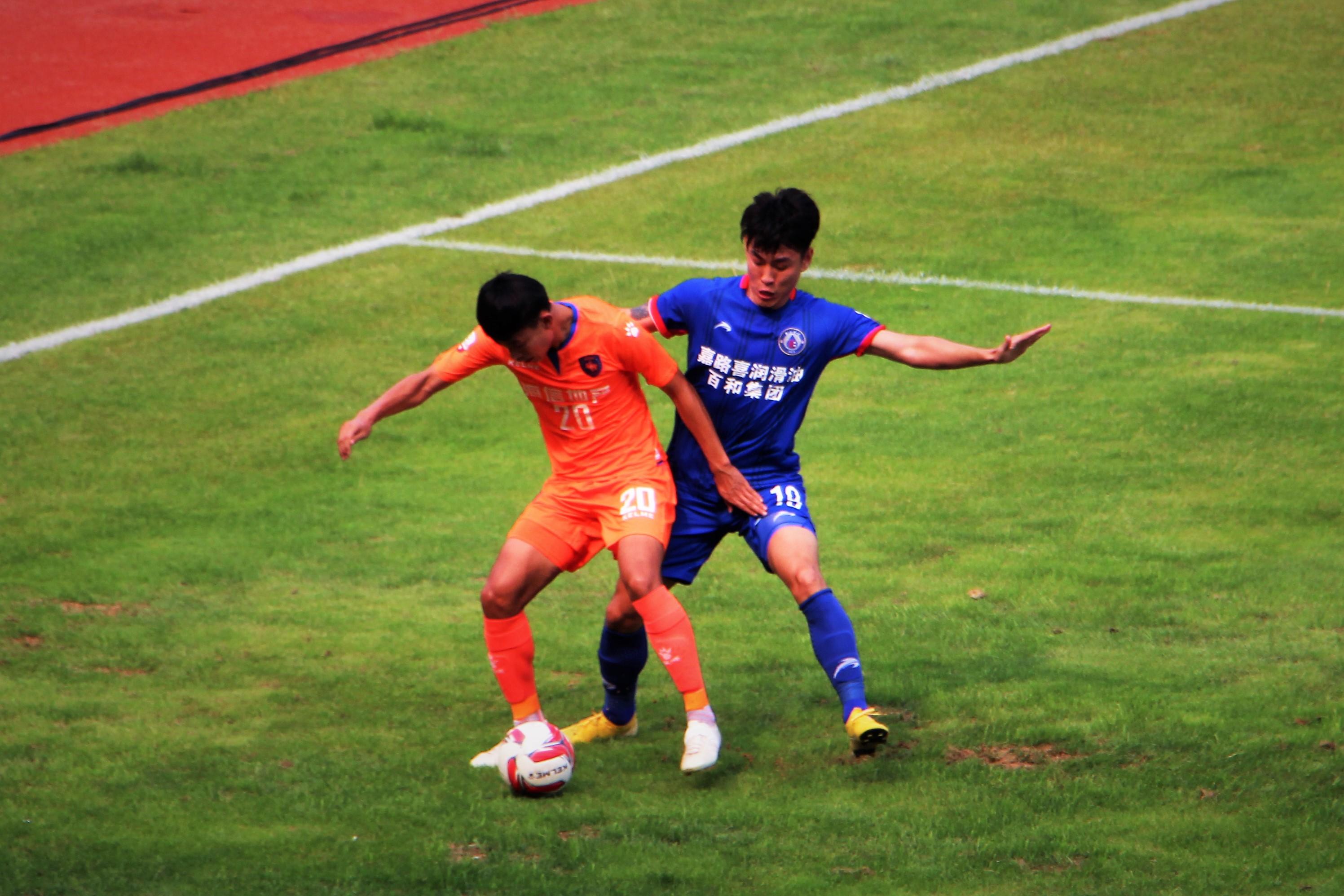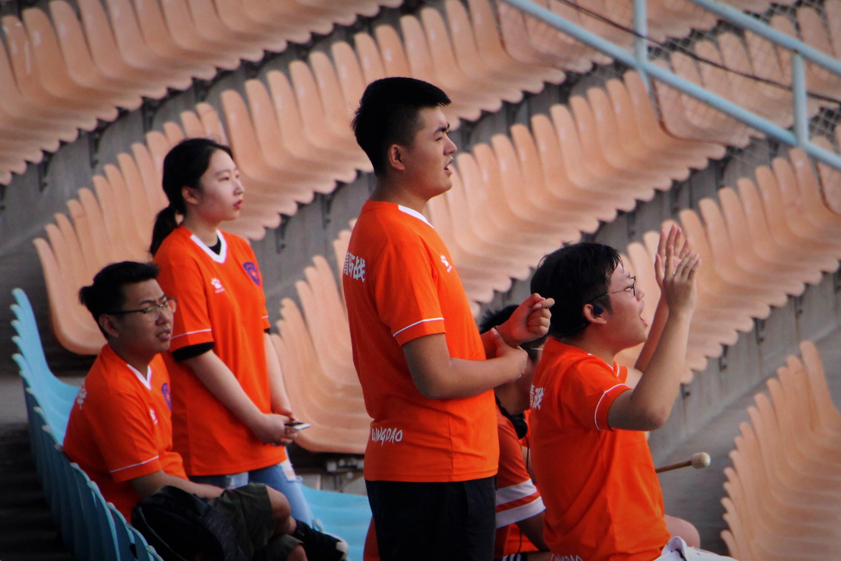 青島中能先進(jìn)球了,具體的情況印象已經(jīng)不深,但大概是在一片混戰(zhàn)當(dāng)中打進(jìn)的。這時(shí)球迷們才稍稍有了些興致,鼓點(diǎn)和助威聲開始在球場(chǎng)內(nèi)蔓延開來,“青島必勝!中能加油!”隱隱約約能夠看得出這里也曾是興盛過、熱鬧過的。盡管歡快的氣氛持續(xù)了沒多久,但至少這個(gè)進(jìn)球也讓這些球迷能算是不虛此行了。中能此后又獲得了不少機(jī)會(huì),只是射術(shù)實(shí)在糟糕,大多數(shù)時(shí)候只能辛苦球童放下手機(jī)跑一趟,比賽才得以繼續(xù)進(jìn)行。