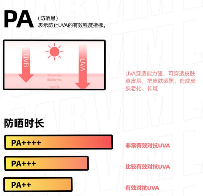PA是指抗UVA的防護(hù)能力,主要反映延緩曬黑的防曬霜的等級(jí),“+”號(hào)越多,防護(hù) UVA能力越強(qiáng)。
