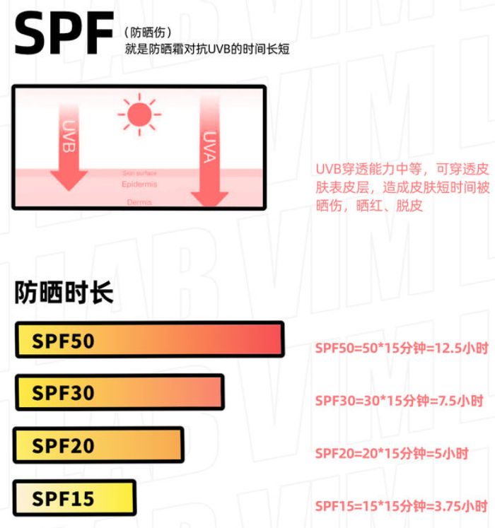 SPF指的是對(duì)UVB的防護(hù)能力,即日光防護(hù)系數(shù),用來評(píng)價(jià)防曬劑防治皮膚發(fā)生日曬紅斑的能力,數(shù)值越大,抵御的時(shí)間越長(zhǎng)。