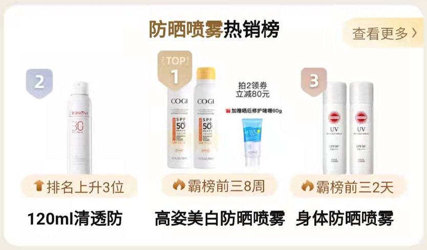 根據(jù)天貓榜單3月9日實(shí)時(shí)數(shù)據(jù)顯示,高姿美白防曬噴霧連續(xù)8周蟬聯(lián)防曬噴霧熱銷榜前三位置。