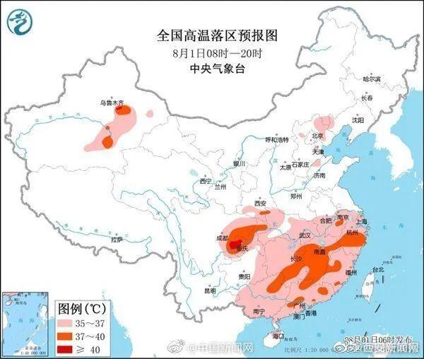 預計8月1日白天,新疆南疆盆地、陜西南部、湖北、江南、華南、四川東部、重慶等地有35℃以上高溫天氣,其中,新疆南疆盆地、湖南東部、江西、浙江南部、福建西部、四川東部、重慶西部、廣西東北部、廣東中北部等地部分地區(qū)高氣溫37~39℃,四川東南部、重慶西南部等地局地可達40℃以上。