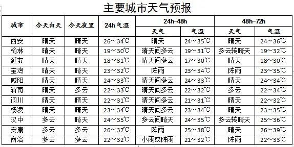 8月7日:全省晴天間陰天,陜北有小到中陣雨、局地有大雨,關中西部部分地方、陜南部分地方有陣雨或雷陣雨。關中南部部分、陜南東部部分地方有36-38℃的高溫天氣,局地可達40℃以上。