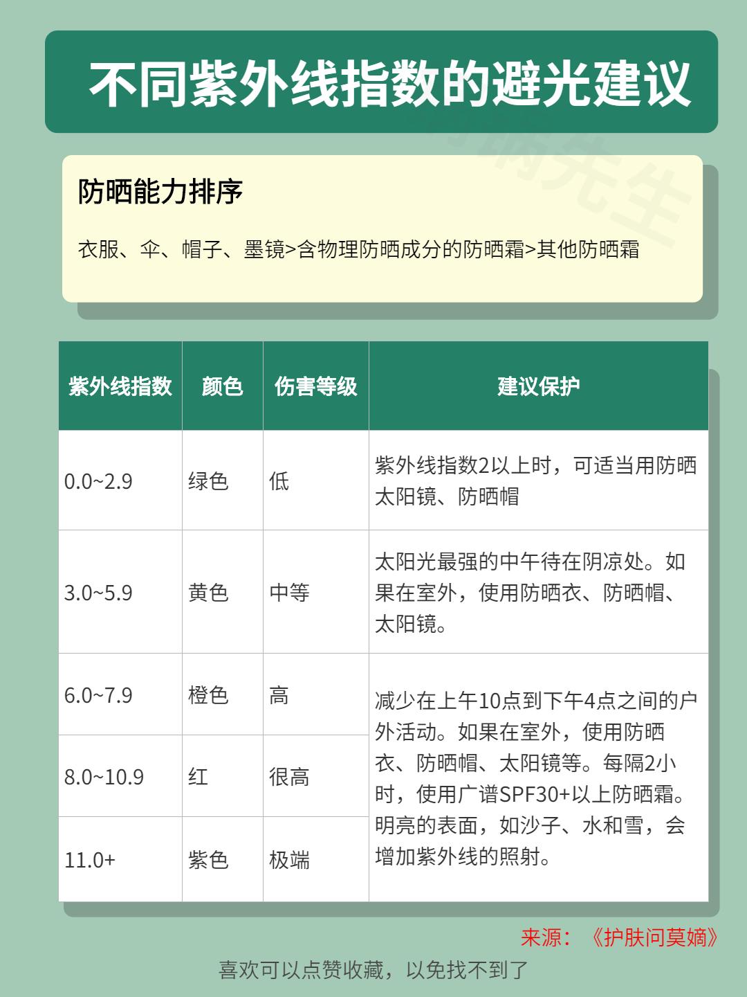 ≤2.0不用涂防曬霜,戴個防曬帽就可以了。>2.0不用涂防曬霜,使用防曬傘、防曬帽、墨鏡等避光。