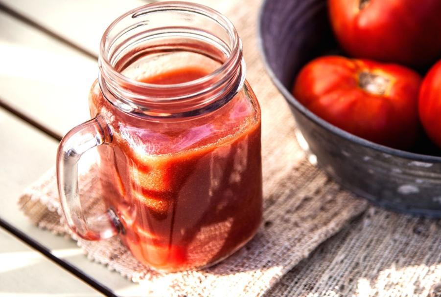 將新鮮的番茄洗干凈之后,榨汁按照5:1的比例把番茄汁與蜂蜜混合在一起攪勻。