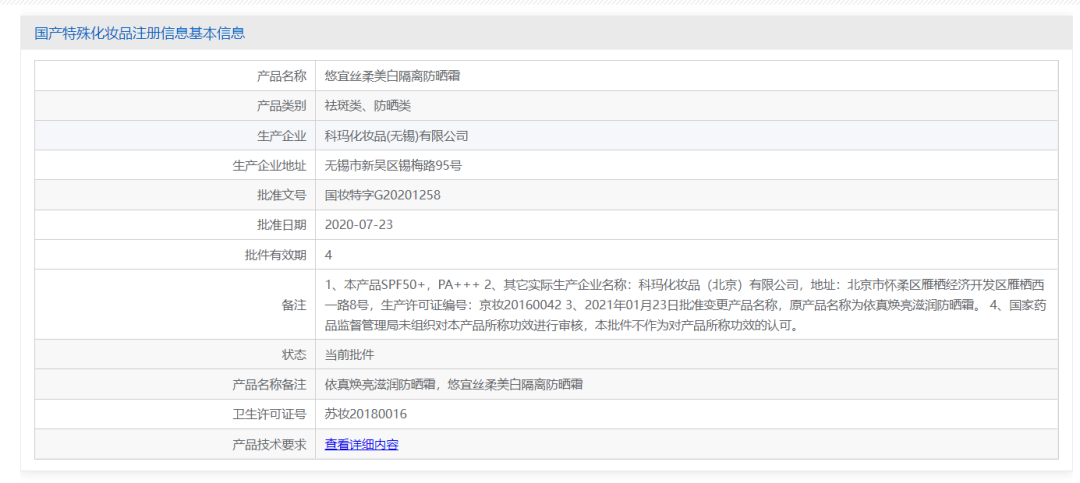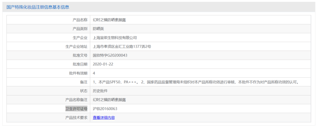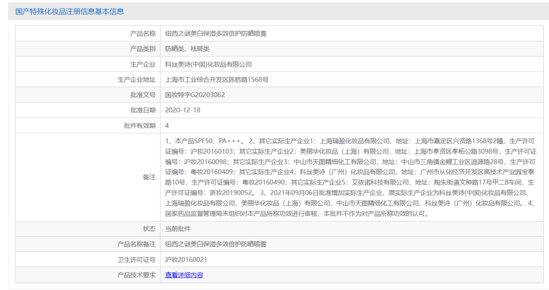 不過(guò),在藥監(jiān)局官方上查到該噴霧產(chǎn)品有專屬的特證國(guó)妝特字G20203062,有效期是4年,所以這兩個(gè)產(chǎn)品并沒有用同一特證。