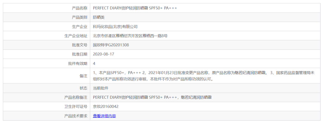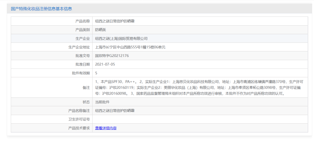 在進(jìn)入藥監(jiān)局平臺(tái)查詢后,發(fā)現(xiàn)該品牌在2021年重新注冊(cè)了國(guó)妝特字G20212176,產(chǎn)品名稱是日常倍護(hù)防曬霜??梢姡谖恼掳l(fā)布前,該品牌日常倍護(hù)防曬霜的天貓?jiān)斍轫?yè)沒有及時(shí)更新,確實(shí)需要做出相應(yīng)解釋和改進(jìn)。