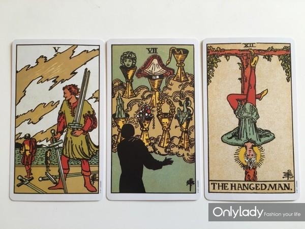 白羊座塔羅牌面:正位寶劍5、正位圣杯7、正位吊人。