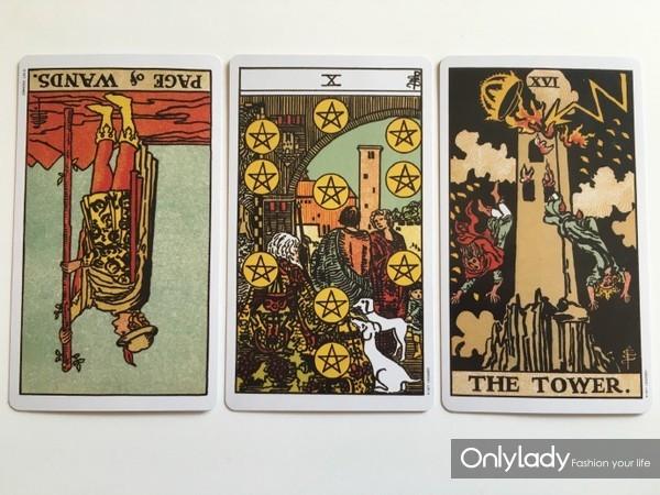 雙魚座塔羅牌面:逆位權(quán)杖侍從、正位星幣10、正位高塔。