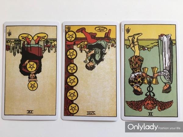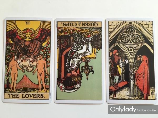 處女座塔羅牌面:正位戀人、逆位圣杯王后、正位星幣3。