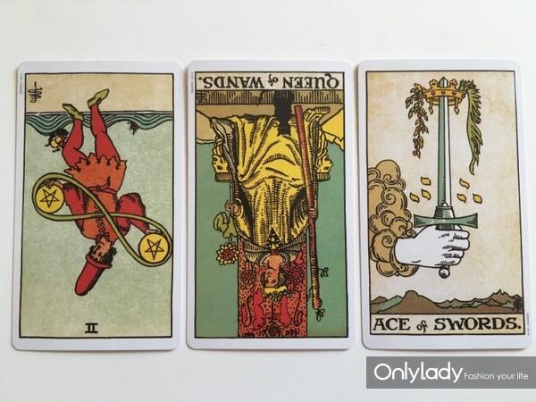 雙子座塔羅牌面:逆位星幣2、逆位權(quán)杖王后、正位寶劍首牌。
