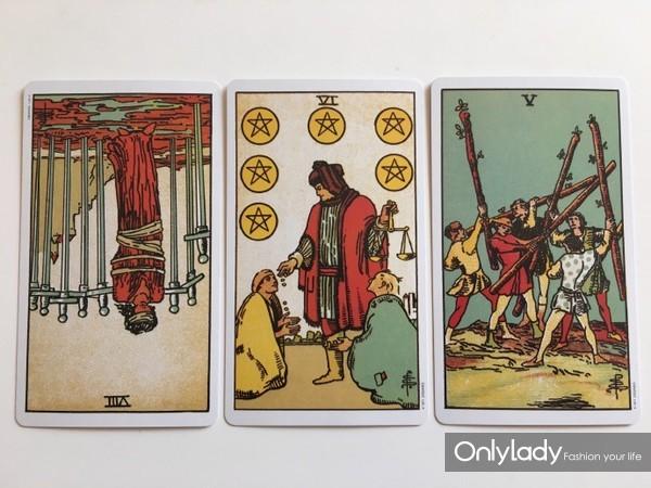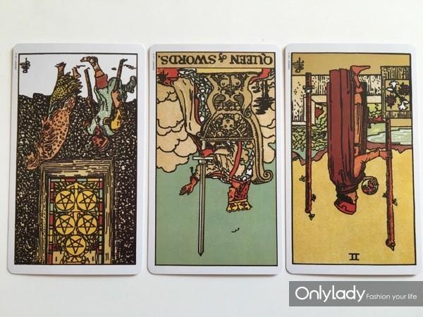 獅子座塔羅牌面:逆位星幣5、逆位寶劍王后、逆位權(quán)杖2。