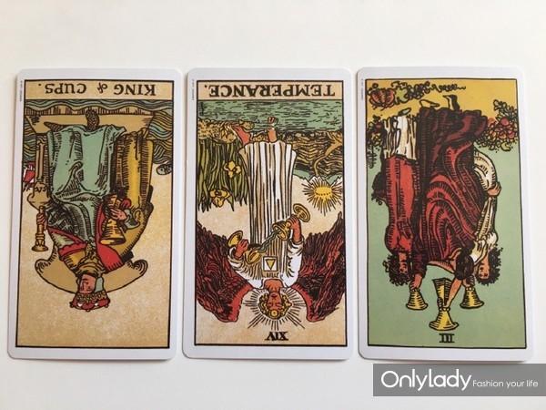 天秤座塔羅牌面:逆位圣杯國王、逆位節(jié)制、逆位圣杯3。