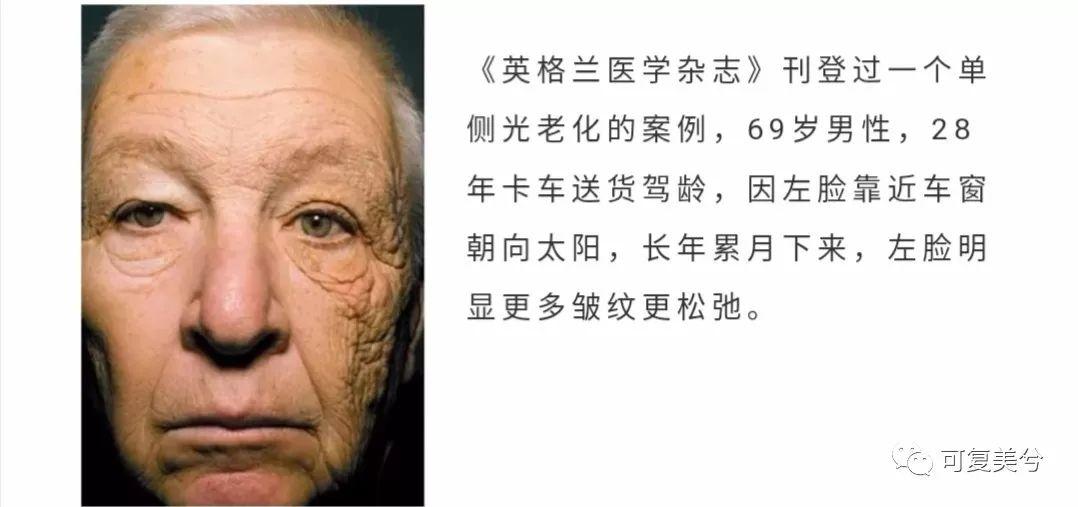 這個(gè)案例大家很熟悉了吧,只要提到UVA光老化,就一定會(huì)擺出這張照片。這是《英格蘭醫(yī)學(xué)雜志》刊登的一個(gè)光老化案例,一個(gè)69歲的老司機(jī),常年跑一條線路送貨,送了28年,因?yàn)樽竽樋看袄鲜潜粫?,日積月累下來(lái),左臉的皺紋松弛巨多。