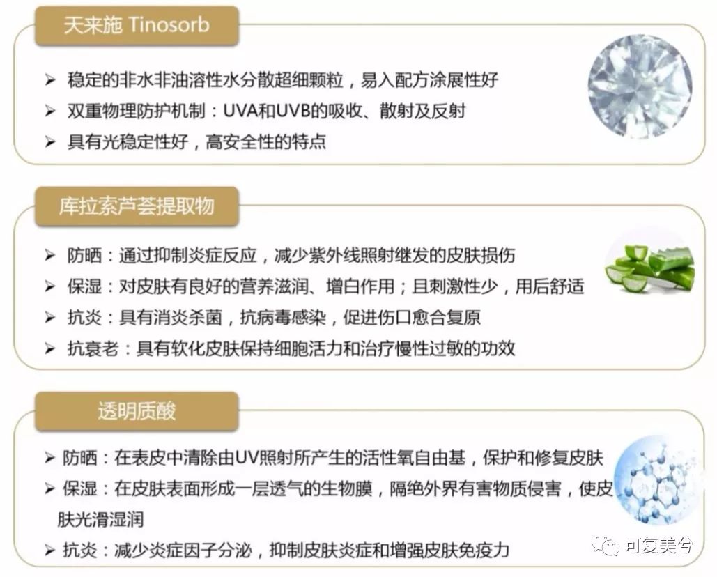 但其實(shí),希睿達(dá)的主要成分是天來(lái)施、蘆薈和透明質(zhì)酸。蘆薈和玻尿酸的作用我們都知道,主要是補(bǔ)水保濕,防曬主要靠的其實(shí)是天來(lái)施(Tinosorb)這個(gè)成分。
