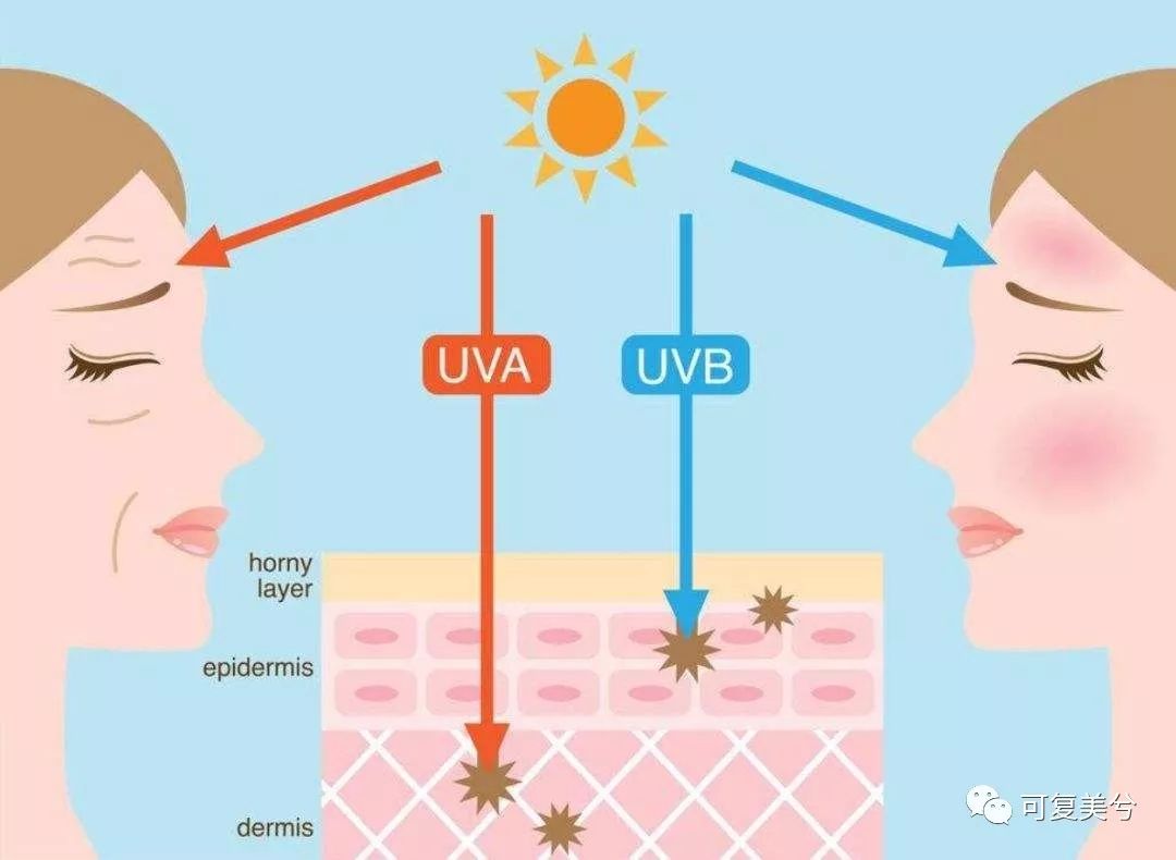 我們經(jīng)常說(shuō)防曬,其實(shí)就是防紫外線,我們需要防的有兩個(gè)波段。一個(gè)是UVA,這個(gè)老大哥心狠手辣,穿透力爆表,云層、玻璃、水根本擋不住他,達(dá)到地面的紫外線有90%都是他,把你曬的黢黑的也是他。他還能穿過(guò)皮膚的表皮層直達(dá)層,損傷膠原蛋白和彈性纖維,把你曬出皺紋,曬老好幾歲。