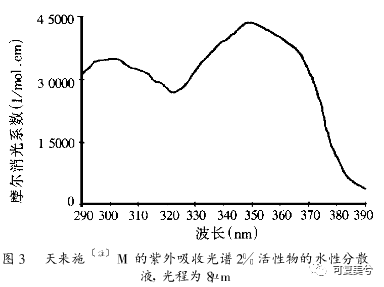 從圖中可以看出,天來(lái)施M這貨,不僅能高的防護(hù)UVA(波長(zhǎng)350左右的消光系數(shù)高達(dá)45000左右),還能防護(hù)UVB,而且UVB的防護(hù)果也很強(qiáng),消光系數(shù)高達(dá)30000左右。