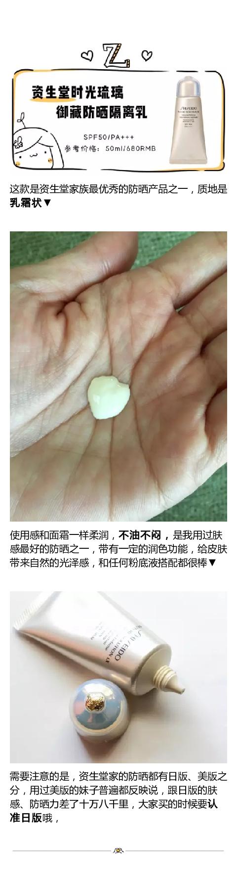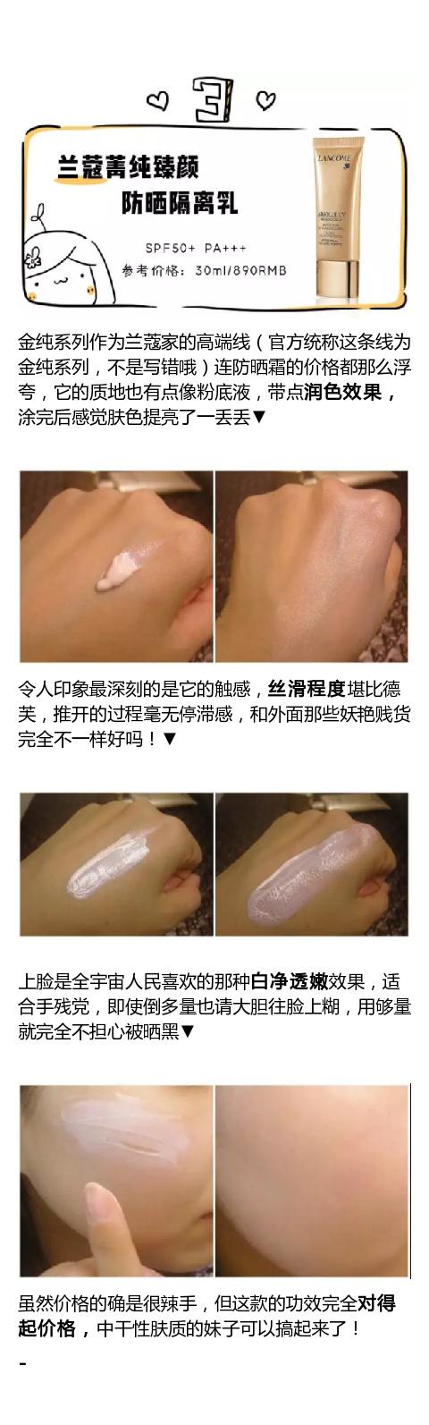 我一開始用的時(shí)候廈門還是夏天,那時(shí)候臉比較油,用起來(lái)感覺(jué)相當(dāng)好啊。后來(lái)慢慢入秋了,可能是吃藥調(diào)理啊看醫(yī)生啊治痘痘啊起效果了,我長(zhǎng)這么大第一次在秋季感覺(jué)臉上皮膚干干!我的臉從大油田變成混合型了,臉干的時(shí)候再用這款會(huì)覺(jué)得有點(diǎn)搓泥。后來(lái)?yè)Q了保濕的水乳霜(媽呀以前從來(lái)沒(méi)專門買過(guò)保濕的護(hù)膚品),一段時(shí)間以后現(xiàn)在再用這個(gè)防曬又不會(huì)搓泥了。