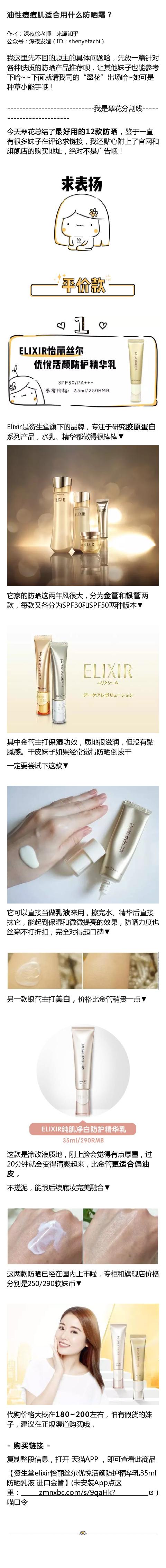 它的質(zhì)地是真的水,抹開稍微按摩一下就被皮膚完全吸收了,瞬間感覺(jué)皮膚潤(rùn)潤(rùn)的,但是是潤(rùn)而不油,真的清爽,同時(shí)也不會(huì)覺(jué)得拔干,沒(méi)有搓泥、泛白的狀況哦~~這款防曬對(duì)于我這個(gè)混油皮來(lái)說(shuō)完全沒(méi)負(fù)擔(dān),不悶痘!真的棒!