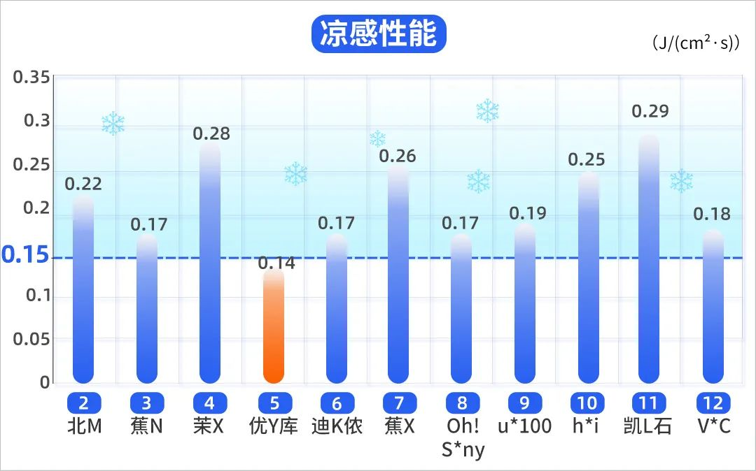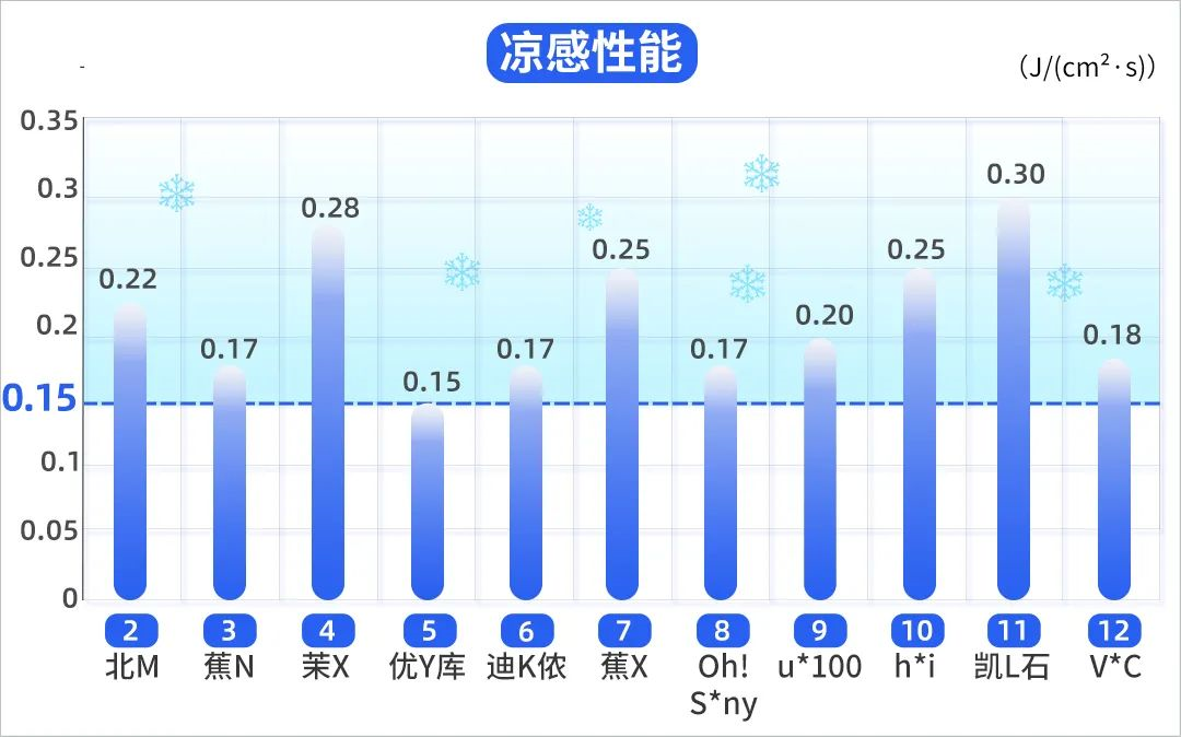 柱子越高,代表皮膚感受到的涼感越強(qiáng)??梢钥吹剑?1 款防曬衣都具有“接觸瞬間涼感性能”。