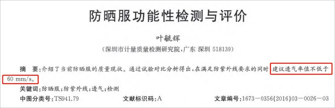 對(duì)防曬衣來說,在防紫外線的前提下,透氣率越高越好。有文獻(xiàn)建議,透氣率值應(yīng)不低于 60mm/s。