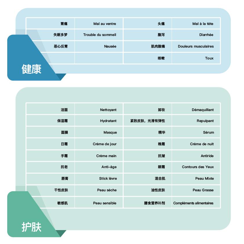 此外,以下我們也列出對應的法文,讓大家在藥妝店購物的時候,不管是健康或肌膚問題,都能夠透過這些單詞,更了解產(chǎn)品特性,或找到對應商品。
