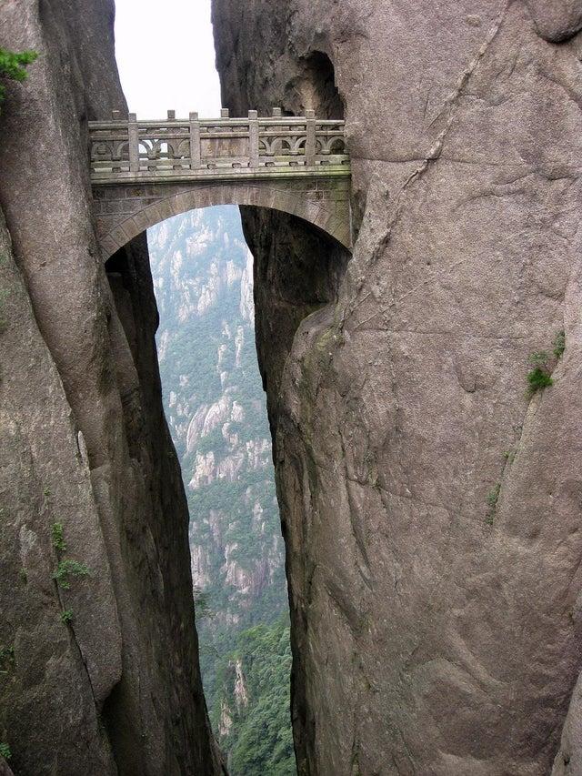一座古老的橋梁,從兩個(gè)石頭中間穿過(guò)。