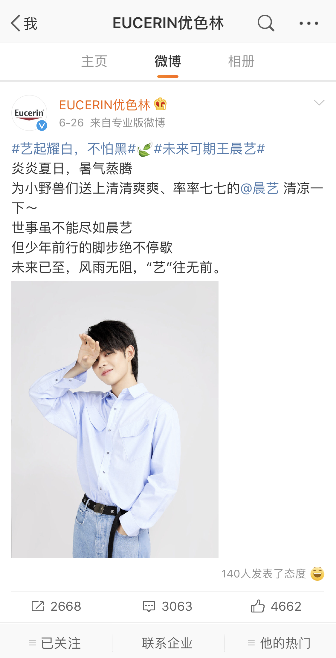 6月23日晚9點(diǎn)22分,Eucerin優(yōu)色林官方微博發(fā)布預(yù)熱海報(bào),宣布即將迎來(lái)首位大中華區(qū)防曬大使, "星晨大海,藝往無(wú)前。這個(gè)夏天,和少年 ????"。文案里藏頭"晨藝",引起粉絲的第一波圍觀、互動(dòng)和熱議。