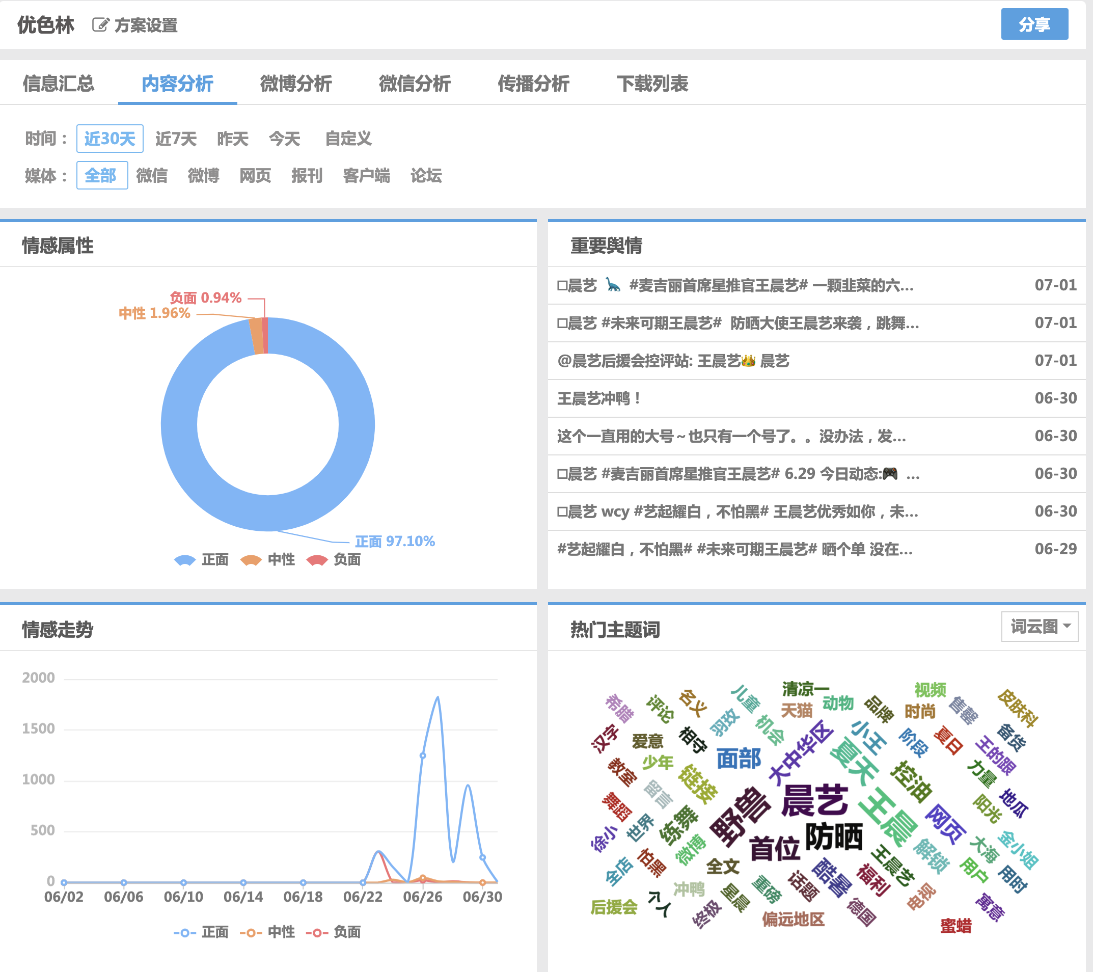 優(yōu)色林防曬乳液在當(dāng)天開(kāi)售10小時(shí),銷(xiāo)量突破6922瓶,銷(xiāo)售額達(dá)到97萬(wàn)元。銷(xiāo)量之外,品牌和產(chǎn)品好評(píng)如潮,粉絲把對(duì)藝個(gè)人的好感直接轉(zhuǎn)移到品牌和產(chǎn)品上。從清博大數(shù)據(jù)的輿情監(jiān)測(cè)看,品牌關(guān)鍵詞正向評(píng)價(jià)內(nèi)容占比達(dá)到97%以上,品牌取得極高好評(píng)。