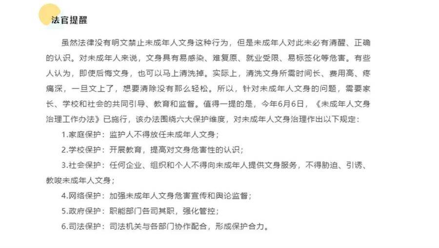 2021年,未滿15周歲還在上初中的小文在上網(wǎng)時(shí)被一些文身圖案所吸引,認(rèn)為文身很好看,遂動(dòng)了想要文身的念頭。