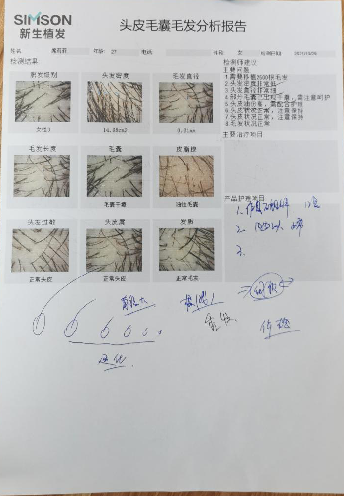 新生植發(fā)毛囊檢測結(jié)果顯示,記者主要問題包括需要移植2500根毛發(fā);頭發(fā)密度低,頭發(fā)直徑細(xì);部分毛囊已出現(xiàn)干癟等。