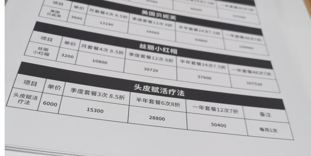同樣是一年前,侯女士在廣州雍禾植發(fā)進(jìn)行毛囊檢測后,對方推薦購買養(yǎng)護(hù)項目,承諾調(diào)節(jié)后可以達(dá)到“頭頂兩邊完全覆蓋,僅剩發(fā)縫寬”的果。她前后付款3萬多元,進(jìn)行七次中胚層注射調(diào)節(jié)及六次養(yǎng)護(hù)調(diào)節(jié)。