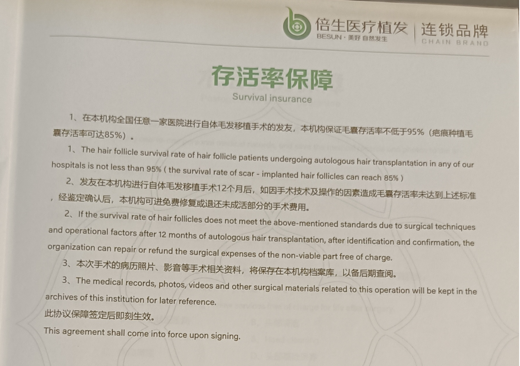 “成活率保障”部分顯示,如因手術(shù)技術(shù)及操作的因素造成毛囊成活率未達(dá)到上述標(biāo)準(zhǔn)經(jīng)鑒定確認(rèn)后,機構(gòu)可免費修復(fù)或退還未成活部分的手術(shù)費用。