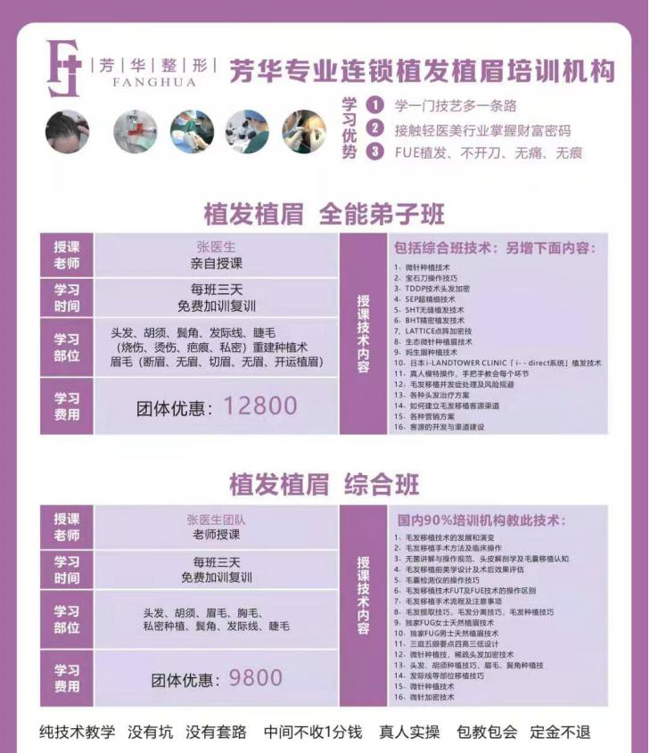 以麥子植發(fā)培訓(xùn)的“植發(fā)植眉全能弟子班”為例,學(xué)習(xí)時間為3天,學(xué)習(xí)部位包括頭發(fā)、胡須、鬢角、發(fā)際線、(燒傷、私密)重建種植術(shù)、眉毛等,費用原價118000元,現(xiàn)需9800元。